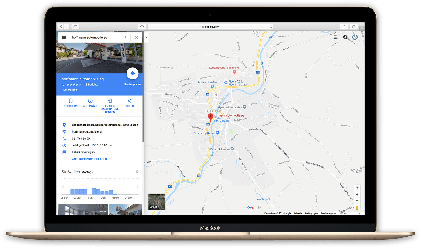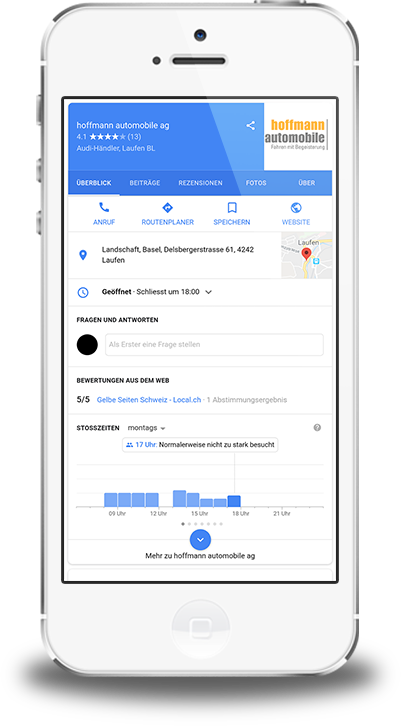 Ihr Eintrag wird eingeblendet, wenn Nutzer in Maps oder auf Google nach Ihrem Geschäft oder vergleichbaren Unternehmen suchen. In Google My Business können Sie Einträge unkompliziert erstellen, ändern und so ganz einfach potenzielle Kunden auf sich aufmerksam machen.